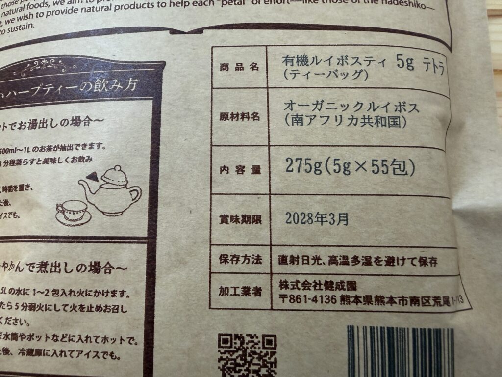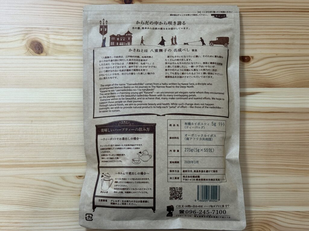 ハーブ&サプリ工房「八重撫子」さんの「ルイボスティー」を購入しました。ティーバッグで5gのテトラ型を選びました。 製品梱包も味も素晴らしかったので(リピート確定です!)、ご紹介したいと思います。ルイボスティーは、飲みやすさと健康への多くのメリットから、日常的な水分補給として非常に人気のあるお茶です。今回あらためて、含まれる主な栄養素や効用もまとめてみました。